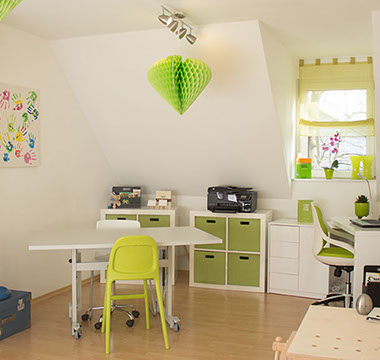 Im Obergeschoss großer Ergotherapieraum für praktische, motorische, handwerkliche sowie kreative Tätigkeiten. Küche für Küchentraining und Alltagstraining vorhanden, sowie ein großes Badezimmer ausgestattet mit Toilette und Waschbecken. Massageraum mit Therapieliege zum Wohlfühlen und entspannen, sowie gezielte Übungen auf der Therapieliege.